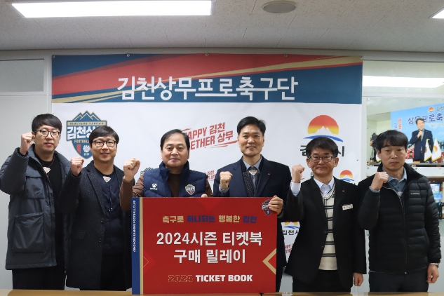 김천상무프로축구단(대표이사 배낙호)이 23일, 김천시스포츠산업과(이하 스포츠산업과)와 김천시축구협회 티켓북 릴레이 구매 행사를 진행했다. 김천상무 홈경기 흥행을 위해 스포츠산업과와 김천시축구협회는 올해도 구매 릴레이를 이어간다.