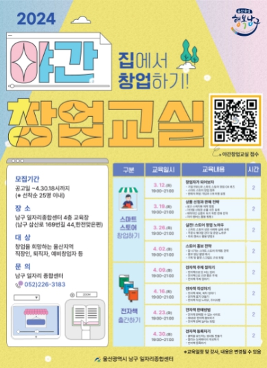 ![]() 남구 일자리종합센터, 집에서 창업하기 운영(야간창업교실) |