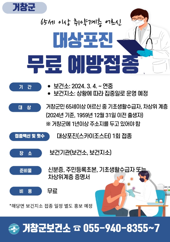 1년 이상 거창군에 거주한 65세 이상 취약계층 어르신이면 무료로 접종이 가능하며, 면지역 보건지소는 추후 접종일을 정할 예정이다.