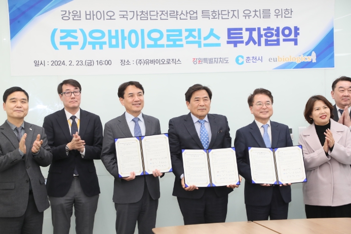 시에 따르면 23일 오후 3시 40분 ㈜유바이오로직스 춘천지점 V플랜트 1층 회의실에서 육동한 춘천시장, 김진태 강원특별자치도지사, 백영옥 ㈜유바이오로직스 대표이사가 참석한 가운데 국가첨단전략산업 바이오 특화단지 유치를 위한 투자협약이 체결됐다.