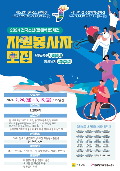 광주·전남 거주자 만 18세 이상(2006년 5월 1일 이전 출생자)이면 누구나 신청할 수 있다. 전국소년(장애학생)체전 자원봉사 누리집으로 신청하거나 활동지역 시군 자원봉사센터에 방문해 신청하면 된다.