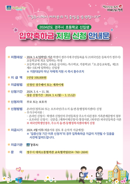 초등학교 입학축하금은 입학일인 3월 4일 기준 경주시에 주소를 둔 초등학교 신입생을 대상으로 10만원이 지원된다.