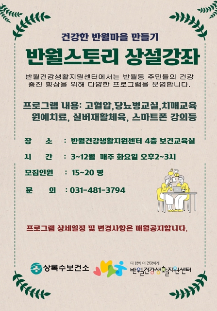 건강강좌 신청 및 자세한 내용은 반월건강생활지원센터로 문의하면 된다.