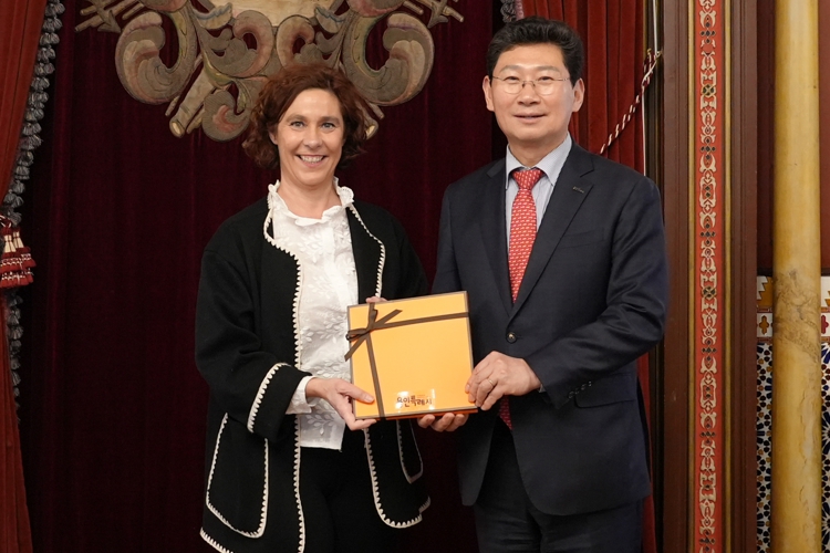 ![]() 이상일 용인특례시장(오른쪽)이 23일(현지시각) 스페인 바스크주 빌바오시 아마이아 아레지 시장 권한대행(왼쪽)과 기념촬영을 하고 있다 |
