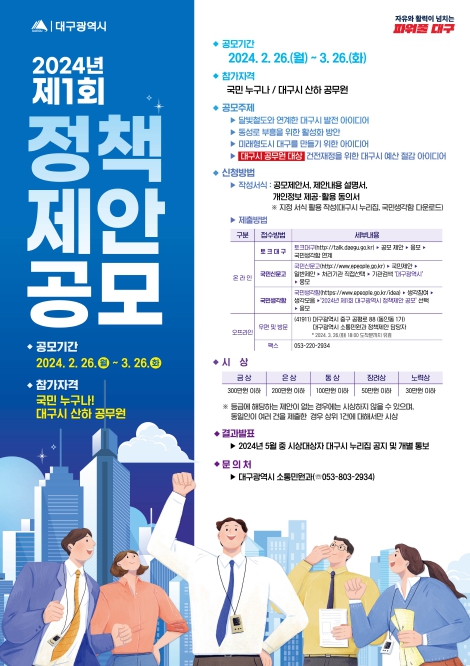 ![]() 대구광역시는 전 국민 및 대구시 산하 공무원의 창의적인 아이디어를 발굴해 시정에 적극 반영하기 위한 ‘2024년 제1회 정책제안 공모’를 추진한다. |
