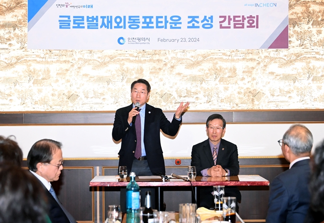 유럽 출장 중인 유정복 인천광역시장은 2월 23일(현지시간) 독일 프랑크푸르트에서 열린 유럽한인총연합회와 소속 한인 동포들과의 간담회 자리에서 글로벌 한인문화타운 조성 비전에 대해 설명했다.