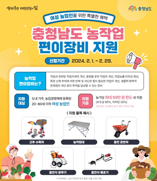 여성 농업인 농작업 편이장비 지원사업은 여성 농업인의 농작업 부담 경감 및 작업 능률 향상을 위한 사업이며 농업경영체에 등록된 20~80세 여성 농업인을 대상으로 하며 선정대상자에게는 편이장비 구매비 최대 50만 원을 지원한다. 올해에는 작년 대비 사업량을 2배 확대해 추진하며, 오는 29일까지 해당 읍면동사무소에서 신청하면 된다.