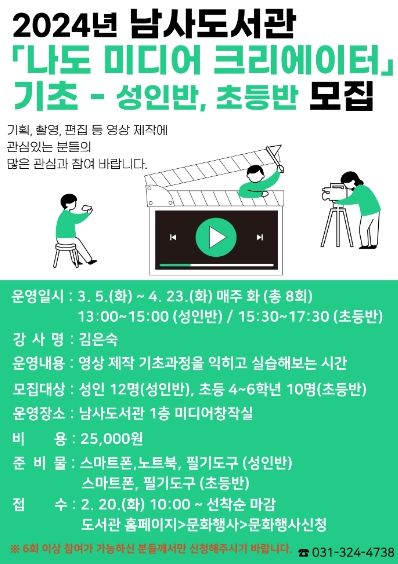 남사도서관 관계자는 “시민 눈높이에 따라 쉽고 재미있게 콘텐츠를 제작할 수 있도록 이번 강좌를 준비했다”며 “미디어 콘텐츠에 관심 있는 시민들이 많이 참여해 미디어 크리에이터로 성장하는 경험을 하기 바란다”고 말했다.