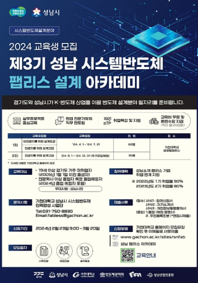 성남시 시스템반도체 팹리스 아카데미는 K-반도체 전략의 핵심인 시스템반도체 산업의 팹리스(설계) 전문인력을 양성하고자 2022년부터 시와 가천대, 한국팹리스산업협회, 반도체공학회, 성남산업진흥원이 협력체계를 구축하고, 전문교육과 취업 연계까지 원스톱으로 지원하는 프로그램이다.