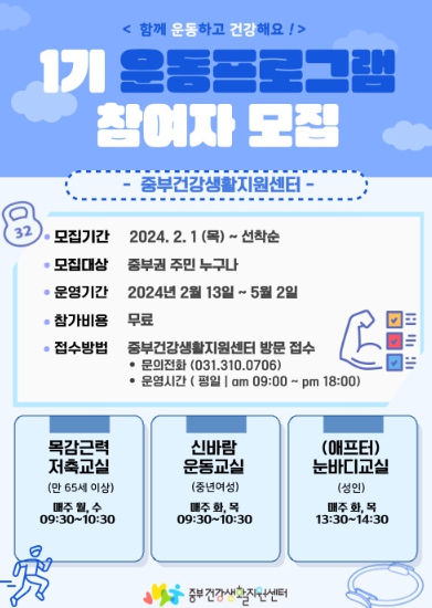 현재 1기 신청은 마감됐으나, 추후 프로그램에 참여를 원하는 시민은 중부건강생활지원센터 운동지도실로 방문해서 신청하거나 전화로도 신청할 수 있다.
