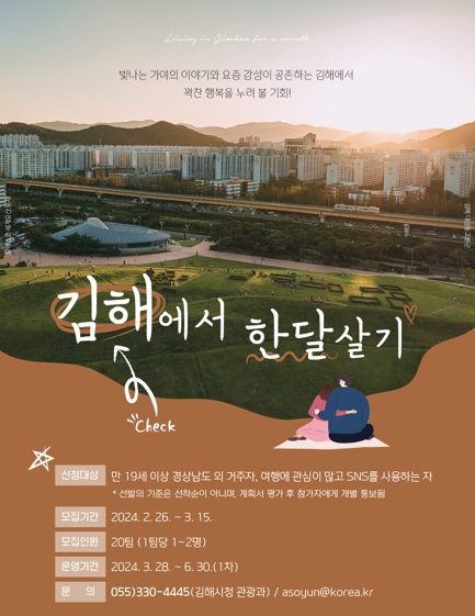![]() 2024 '김해에서 한 달 여행하기' ‘김해에 반해’ 참가자 모집(1차) |