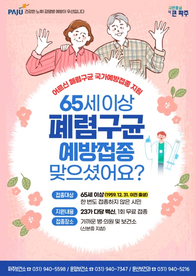 ![]() 파주시, 65세 이상 어르신 폐렴구균 무료 예방접종 |
