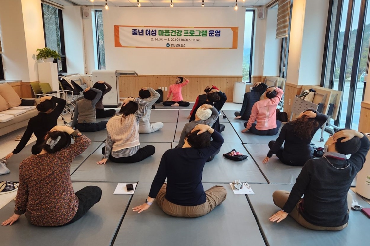 ![]() 중년 여성 마음건강프로그램 대상자들이 요가 및 명상 수업에 참여하고 있다. |