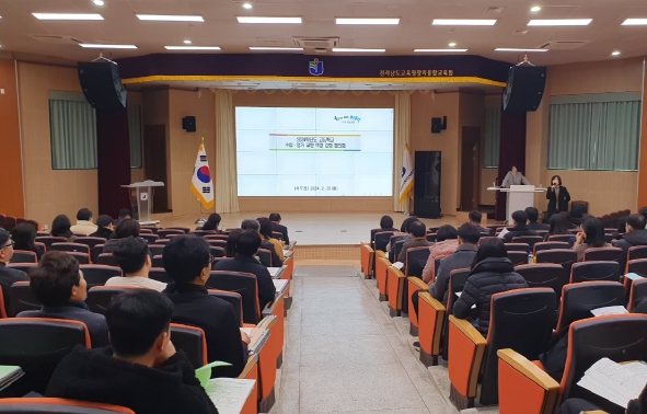 ![]() 26일 전남교육청창의융합교육원에서 ‘고등학교(서부권) 수업ㆍ평가 교원역량 강화 협의회’가 진행되고 있다. |