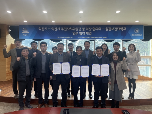 시는 26일 원광보건대학교에서 고등직업교육 거점지구 사업(Higher Vocational Education hub district, 이하 하이브·HiVE)의 성공적인 추진과 거버넌스 구축을 위한 협약식을 개최했다.