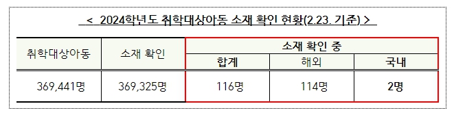 2월 23일 기준으로 소재가 확인되지 않은 아동 116명 중 114명은 해외로 출국한 것으로 파악되어 외교부(장관 조태열)와 현지 공관을 통해 현지 경찰에 수사를 의뢰하는 등 소재 확인을 진행하고 있다. 국내에 거주하는 것으로 추정되는 2명에 대해서도 지속해서 수사하고 있으며, 학교 현장에서도 입학일 이후 출석 확인 등을 통해 점검을 실시할 계획이다.