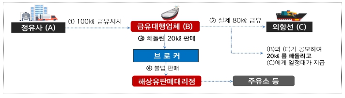 반면, 급유대행업체가 외항선박과 공모하여 정유사로부터 지시받은 해상면세유를 전량 급유하지 않고 일부를 빼돌려 브로커를 통해 해상유판매대리점에게 값싸게 판매하는 등 해상면세유를 불법 유통하고 있다.
