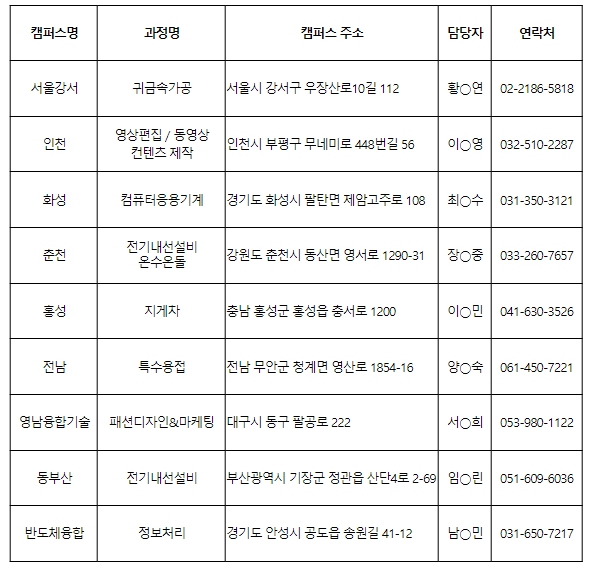 ![]() 다문화청년 특화 훈련 운영 캠퍼스 현황 및 연락처 |