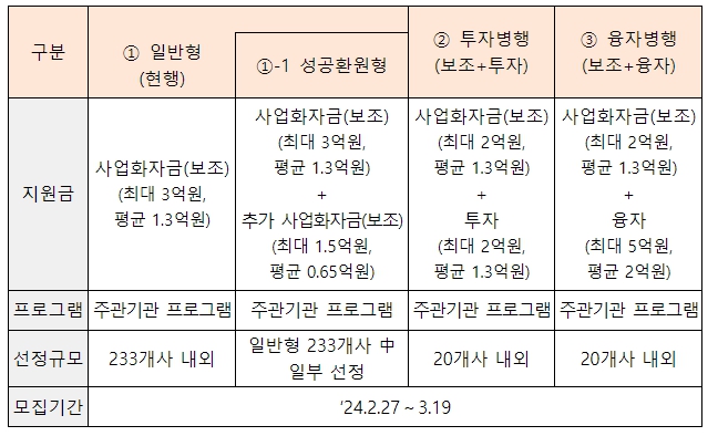 융복합 지원 방식은 3가지 유형으로 나뉘며, 사업화 성공 시 환원하는 ‘성공환원형’, 보조와 투자를 결합한 ‘투자병행형’, 보조와 융자를 결합한 ‘융자병행형’으로 구성된다.