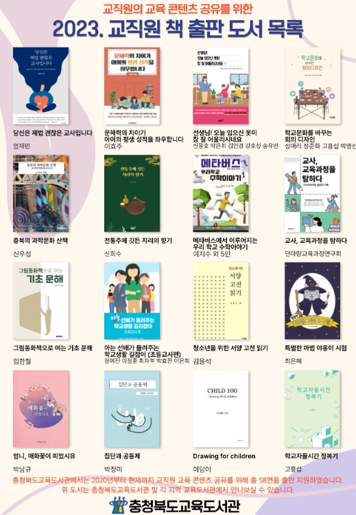 이번 사업으로 출판된 도서는 내년 1월부터 두 달 동안 도교육청을 비롯해 교육도서관, 단재교육연수원 등에서 운영되는 책 출판 도서 전시회에 활용되고, 충북교육도서관 및 각 지역교육도서관 열람 및 대출을 통해 도민, 교육 가족과 함께 할 예정이다.