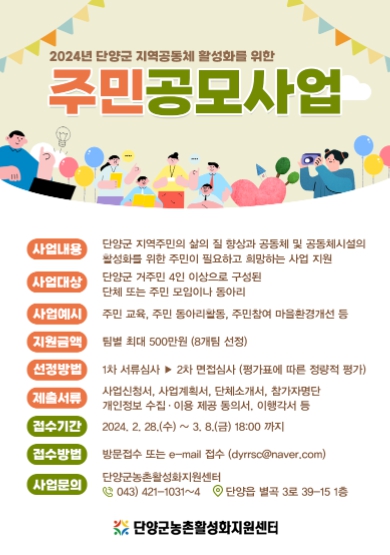 신청은 단양군 홈페이지에 게시된 공고문을 확인하고 사업신청서, 사업계획서, 단체소개서, 명단 등 관련 서류를 갖춰 2월 28일부터 3월 8일까지 단양군농촌활성화지원센터로 방문하거나 e메일로 신청하면 된다.