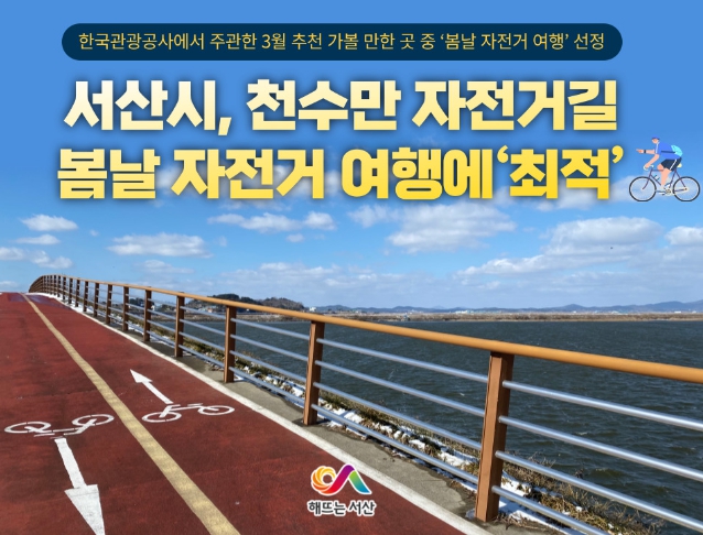 ![]() 한국관광공사 주관 3월 추천 가볼 만한 곳 중 ‘봄날 자전거 여행’테마에 충남 유일 선정된 서산시 천수만 자전거길 홍보물 |