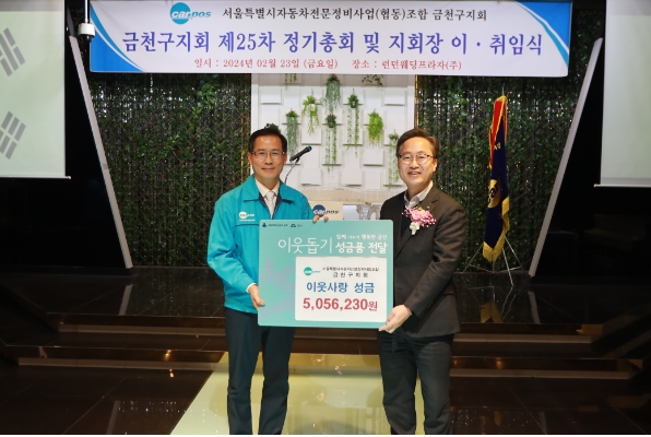 성금 전달식은 금천구지회 제25차 정기총회에서 유성훈 구청장과 정춘식 금천구지회장, 조합 관계자 등 130여 명이 참석한 가운데 진행됐다.