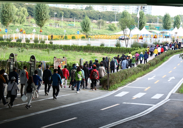 ![]() 2023년 ‘안양천사랑 가족건강 걷기’ 오프라인 행사 참가자들이 안양천변을 걷고 있다. |