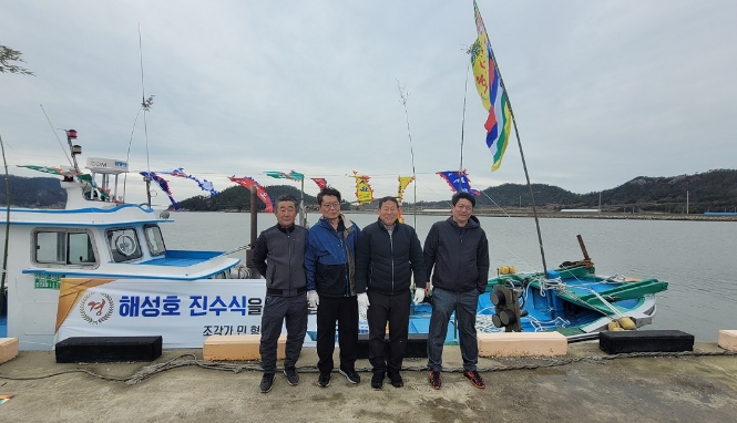 하의고등학교에 윤리 교사로 초임 발령을 받아 근무했던 하동연 선생님이 고향을 지키며 살아가고 있는 제자 2명에게 퇴직금을 쾌척하여 4.11톤급 해성호(연안 복합)를 매입해서 진수식을 가진 것이다.