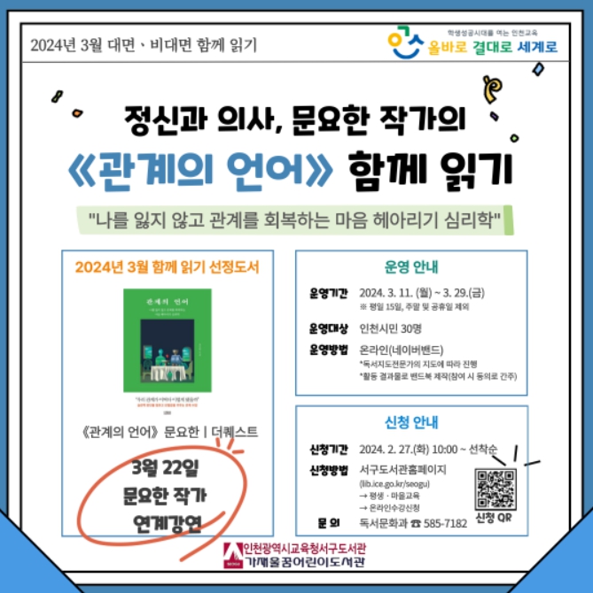 '대면·비대면 함께 읽기'는 인천시민을 대상으로 월별로 지정된 도서를 함께 읽고, 연계 강연을 운영하는 프로그램이다. ▶함께 읽기 ▶한 줄 서평 쓰기 ▶저자 강연 등 다양한 활동을 통해 독서 활동을 지원한다.
