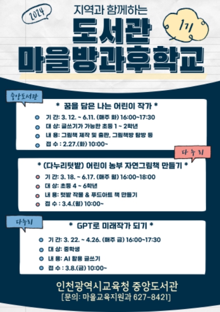 중앙도서관에서는 초등학생을 대상으로 ▶꿈을 담은 나는 어린이 작가 ▶미래직업체험 ‘내 꿈을 job아라’ ▶책 속 과학실험 등 3개 프로그램을 3월 12일부터 운영한다. 다누리에서는 ▶어린이 농부 자연그림책 만들기 ▶GPT로 미래작가 되기 등 2개 프로그램을 3월 18일부터 진행할 예정이다.