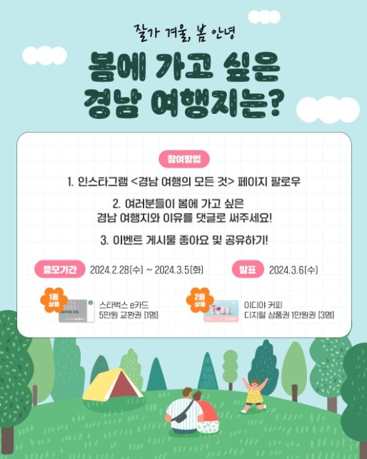 봄맞이 이벤트 참여 방법은 누리소통망을 팔로우한 후 봄에 가고 싶은 경남 여행지와 이유를 댓글에 달고 이벤트 게시물에 ‘좋아요’와 ‘공유하기’를 누르면 된다. 추첨을 통해 당첨자에게는 음료 쿠폰을 제공할 예정이다.
