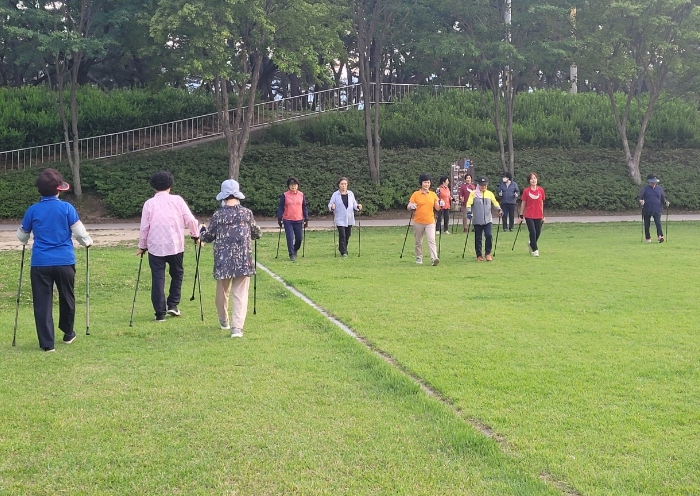![]() 지난해 삼문동 주변 솔밭 길에서 실시된 저녁 걷기(노르딕 워킹) 교실 운영 모습 |