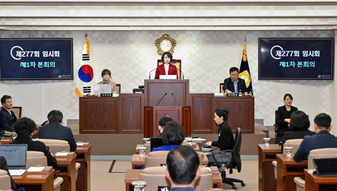 회기 첫날인 27일 제1차 본회의에서는 심윤정 의장의 개회사를 시작으로 제277회 임시회 회기결정의 건, 2023회계연도 결산검사위원 선임, 구청장 및 관계공무원 출석요구의 건, 휴회의 건 등 안건을 처리했다.