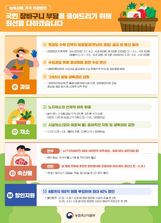 ❹ (축산) ▸한우는 3월 중 2차 '소(牛)프라이즈! 2024 대한민국 한우세일', 최대 50% 할인, ▸한돈은 3월까지 20~40% 할인, ▸계란 가격 안정 대책 추진