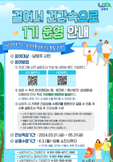 3월 1일부터 5월 31일까지 80만 보 걷기를 달성한 뒤, 6월 3일부터는 권역별 지정 장소에서 선착순으로 기념품을 받을 수 있으며, 지정 장소는 남양주보건소 건강증진실, 동부보건센터 3층 사무실, 건강생활지원센터(와부/호평/오남/별내) 4개소로 총 6곳이다.
