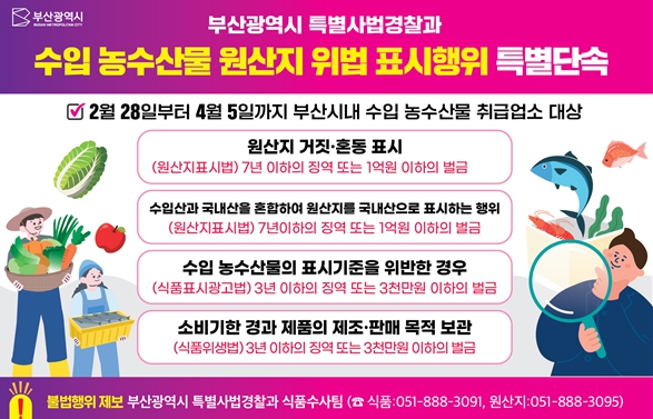 박형준 시장은 “이번 특별단속으로 최근 국내 농수산물 가격 상승으로 발생할 수 있는 수입 농수산물의 원산지 둔갑 행위 등 불법행위를 사전에 차단할 수 있을 것으로 기대한다”라며, “우리시는 시민의 알 권리와 선택권을 확보하고, 안전한 먹거리 환경을 제공하기 위해 앞으로도 다양한 수사를 벌여나갈 것”이라고 밝혔다.