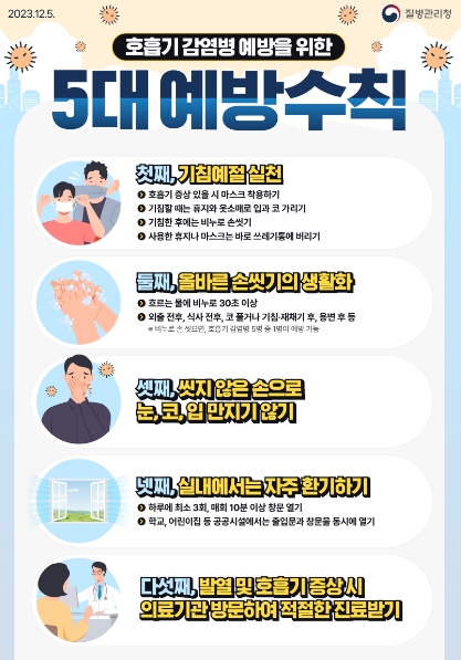 호흡기 감염병을 예방하기 위해서는 올바른 손 씻기와 기침 예절 준수, 주기적인 실내 환기, 호흡기 증상이 있을 시 마스크 착용 및 의료기관을 방문해 적절한 진료 받기 등이 중요하다.