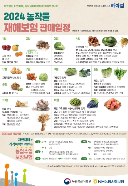 농작물 재해보험은 태풍, 우박, 집중호우, 동상해 등 자연재해와 조수해, 화재로 인한 농작물 및 시설 피해 발생 시 일정 부분을 보상해 주는 보험으로, 보험 가입 금액(생산액 또는 생산비) 200만원(일부 품목상이) 이상이면 농작물재해보험에 가입할 수 있다. 가입품목은 사과, 배, 벼 등 70개 품목이며, 품목별 판매기간 내에 지역농협(또는 품목농협)에 방문 해 가입하면 된다.