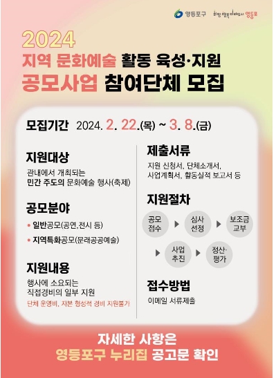 자세한 내용은 영등포구청 누리집 ‘우리구소식’ 게시판의 모집 공고문을 확인하거나 영등포구청 문화체육과로 연락하면 안내받을 수 있다.