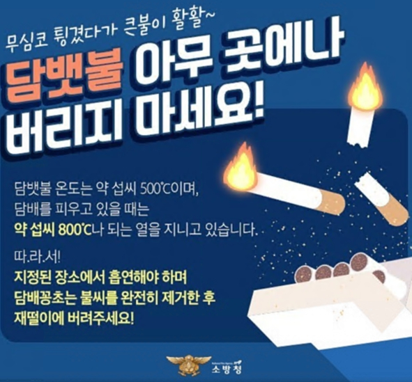 주요 화재 원인은 담배꽁초(17,741건), 음식물 조리(8,182건), 화원방치(7,545건), 쓰레기 소각(6,341건) 순으로 나타났다.