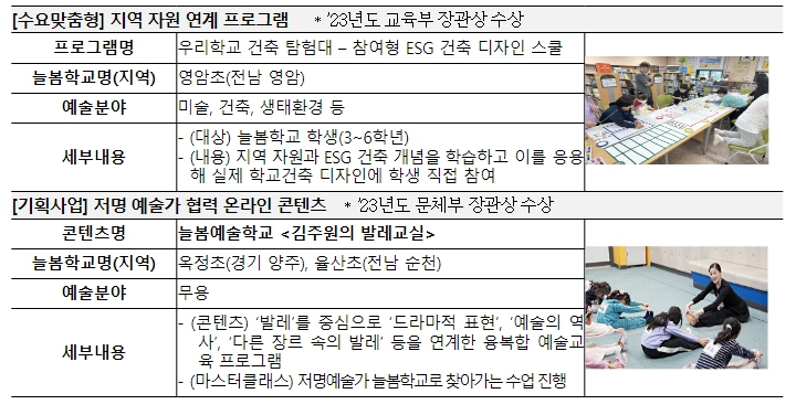 지난해 진흥원은 총 32개 초등학교, 학생 1,500여 명을 대상으로 시범 운영한 ‘늘봄학교’에 학교 인근의 지역자원을 연계한 융·복합 문화예술교육 프로그램과 ‘꿈다락 문화예술학교 우수 프로그램’을 지원한 바 있다. 특히 김주원 발레리나(무용), 최정화 작가(미술) 등 저명예술인이 참여해 제작한 ‘늘봄예술학교’ 온라인 교육콘텐츠* 중 ‘김주원의 발레교실’은 ‘늘봄학교 마스터클래스’도 운영(2회)해 학생과 학부모들에게 큰 호응을 얻었다.