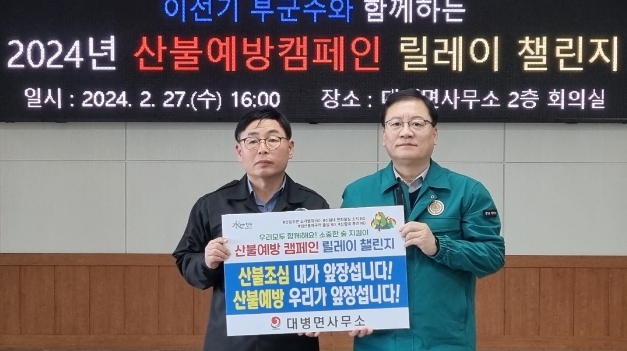 이날 이동렬 면장으로부터 릴레이 챌린지를 이어받은 이선기 부군수는 “대병면에서 추진하는 릴레이 챌린지에 동참했음을 뜻깊게 생각한다”며 “앞으로도 산불예방을 위해 주민들의 관심과 경각심을 높이고 동참 분위기를 확산해 산불발생 제로화를 달성하는 데 대병면이 앞장서 주기를 바란다”고 말했다.