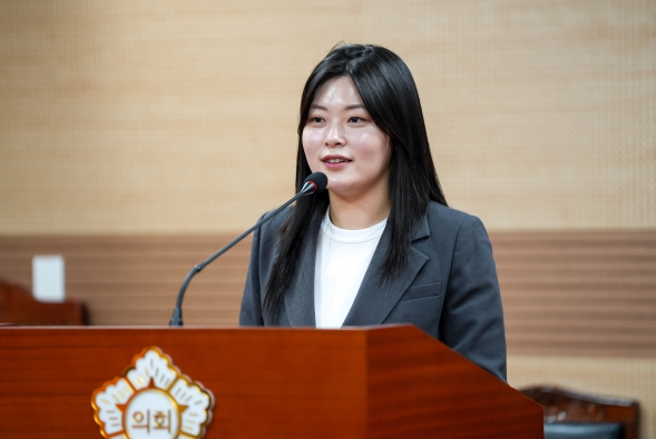 ![]() 김미성 의원이 「아산시 맨발걷기 활성화 지원에 관한 조례안」을 발의하고 취지를 설명하고 있다. |