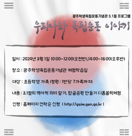 ![]() 광주학생독립운동기념회관, 제105주년 3‧1절 맞아 ‘우리나라 독립운동 이야기 ’프로그램 운영 |
