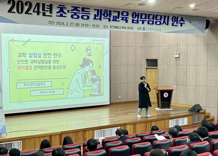 28일 시교육청에 따르면 이번 연수는 과학실험실의 안전한 운영과 올해 과학교육 내실화 계획 주요 사항 안내를 위해 마련됐다. 특히 지난 2022년 개정된 ‘화학물질관리법’과 시행규칙에 따라 과학실험실 내 화학물질 관리가 엄격해져 이에 대한 안내가 이뤄졌다. 해당 법령에 따르면 유해화학물질 진열·보관 장소에는 반드시 관련 물질에 대한 표시와 점검이 있어야 한다.