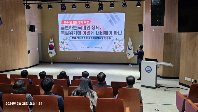 반길주 고려대학교 국제기구센터장의 ‘급변하는 국내외 정세, 복합 위기에 어떻게 대비해야 하나’라는 주제의 특강으로 진행된 이날 교육에서는 세계열강과 동북아 주변국의 군사․경제․외교 정세, 북한의 핵실험 추진과 미사일 발사 등을 안내하며, 불안정한 국제 정세와 안보 환경 변화에 따른 공직자 역할의 중요성이 강조됐다.