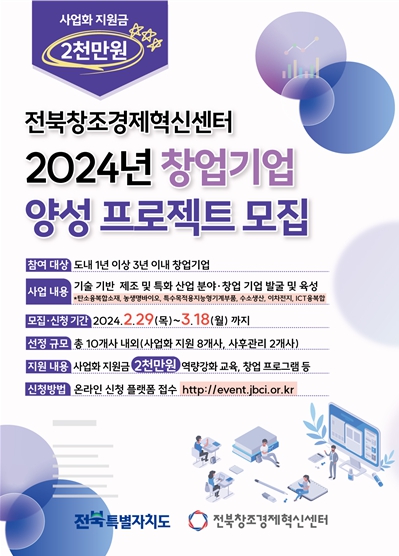 천세창 기업유치지원실장은 “전북자치도는 지역의 성장동력과 고용창출의 원천이 되는 창업기업의 성공을 위해 다양한 자원을 동원해 전방위의 지원을 할 수 있도록 더욱 노력하겠다”며, “2024년 창업기업 양성프로젝트에 창업기업들의 많은 관심과 참여를 바란다”고 말했다.