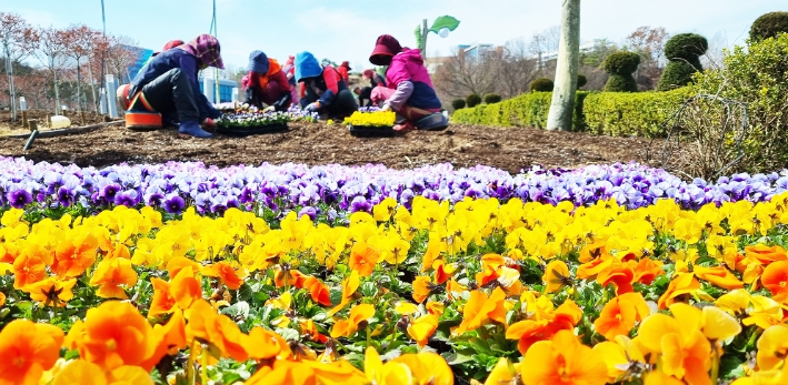 함평군은 28일 제26회 함평나비대축제를 앞두고 축제 분위기 고조 및 아름다운 시가지 미관 조성을 위해 근로자들이 엑스포공원에 비올라 등을 식재해 화단을 조성했다.