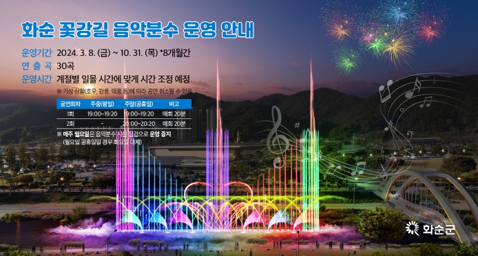 화순 꽃강길 음악분수는 3월 8일부터 10월 말까지 평일 1회, 주말 ‧ 공휴일 2회씩 운영할 예정이며, 음악분수 운영시간을 계절별 일몰 시각에 맞추어 탄력적으로 변경·운영할 계획이다.